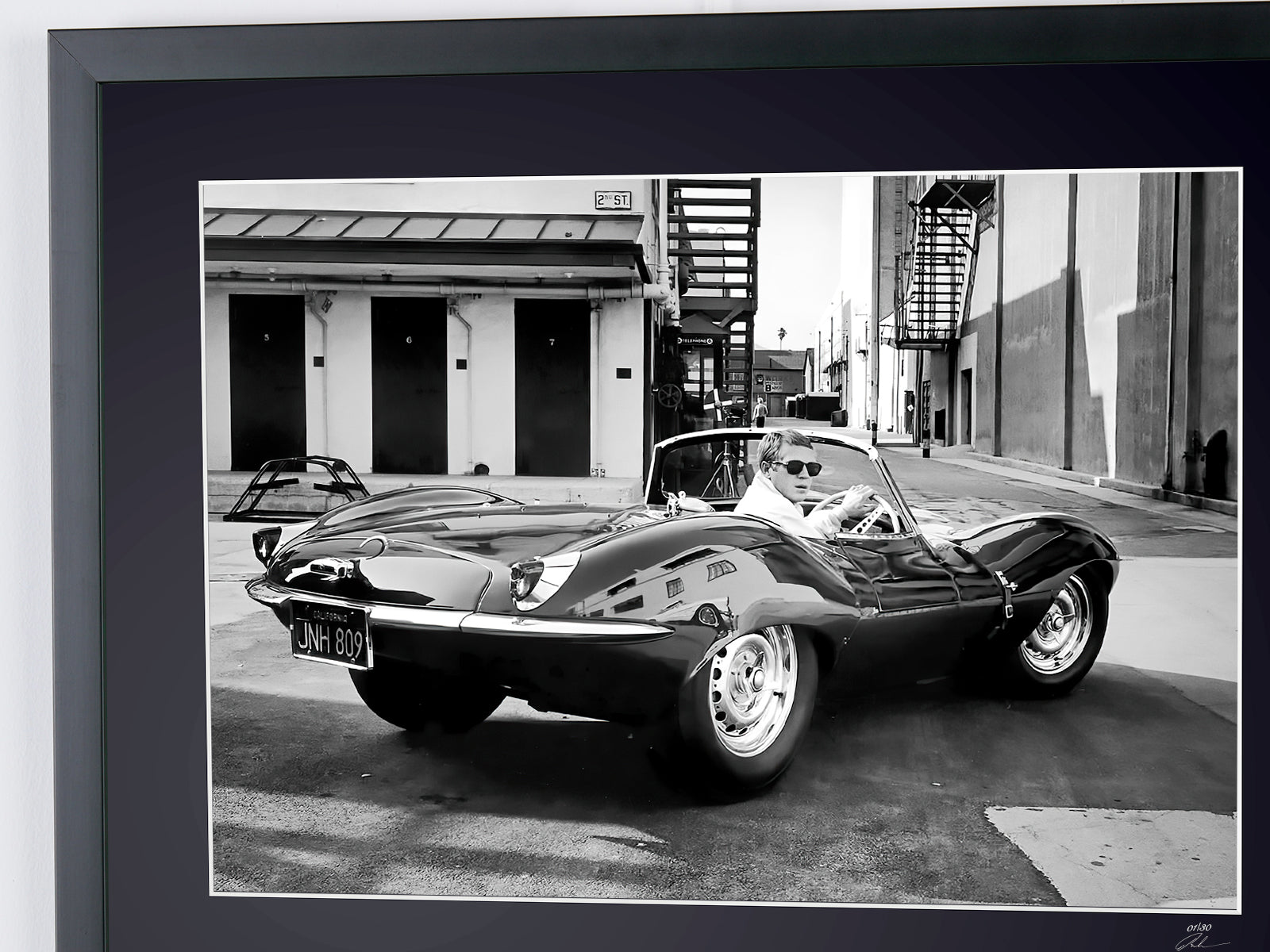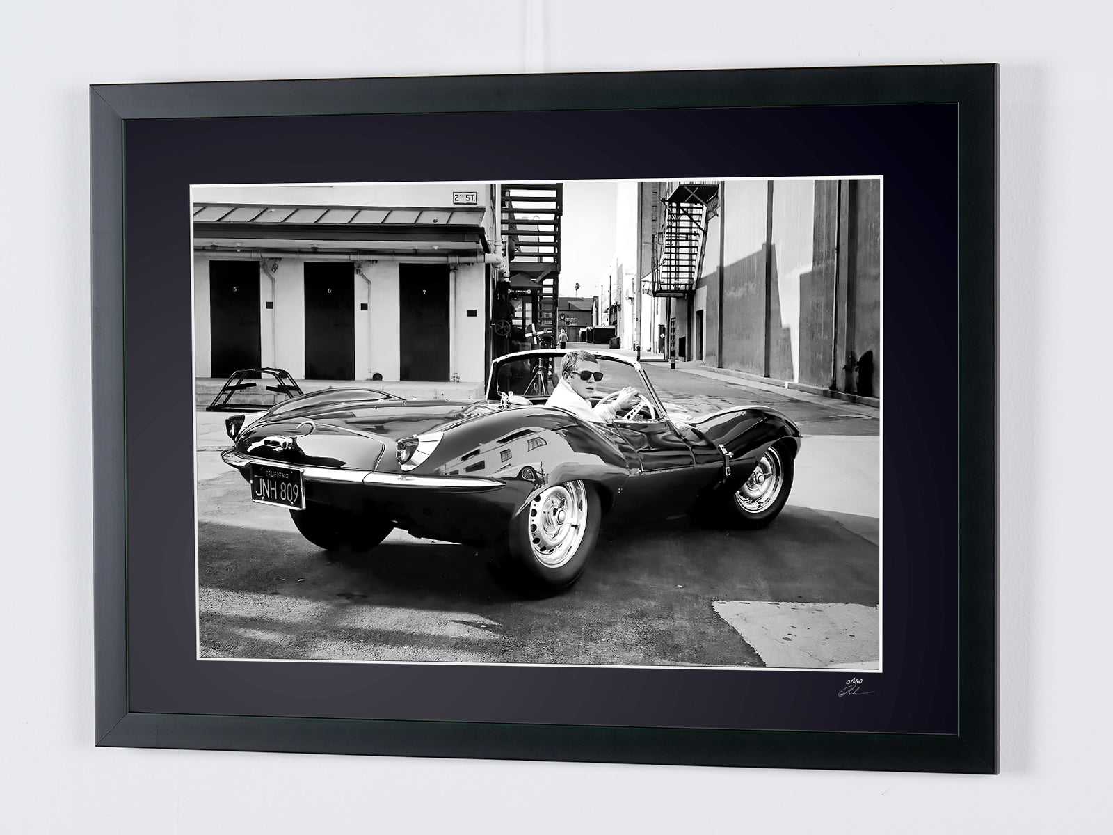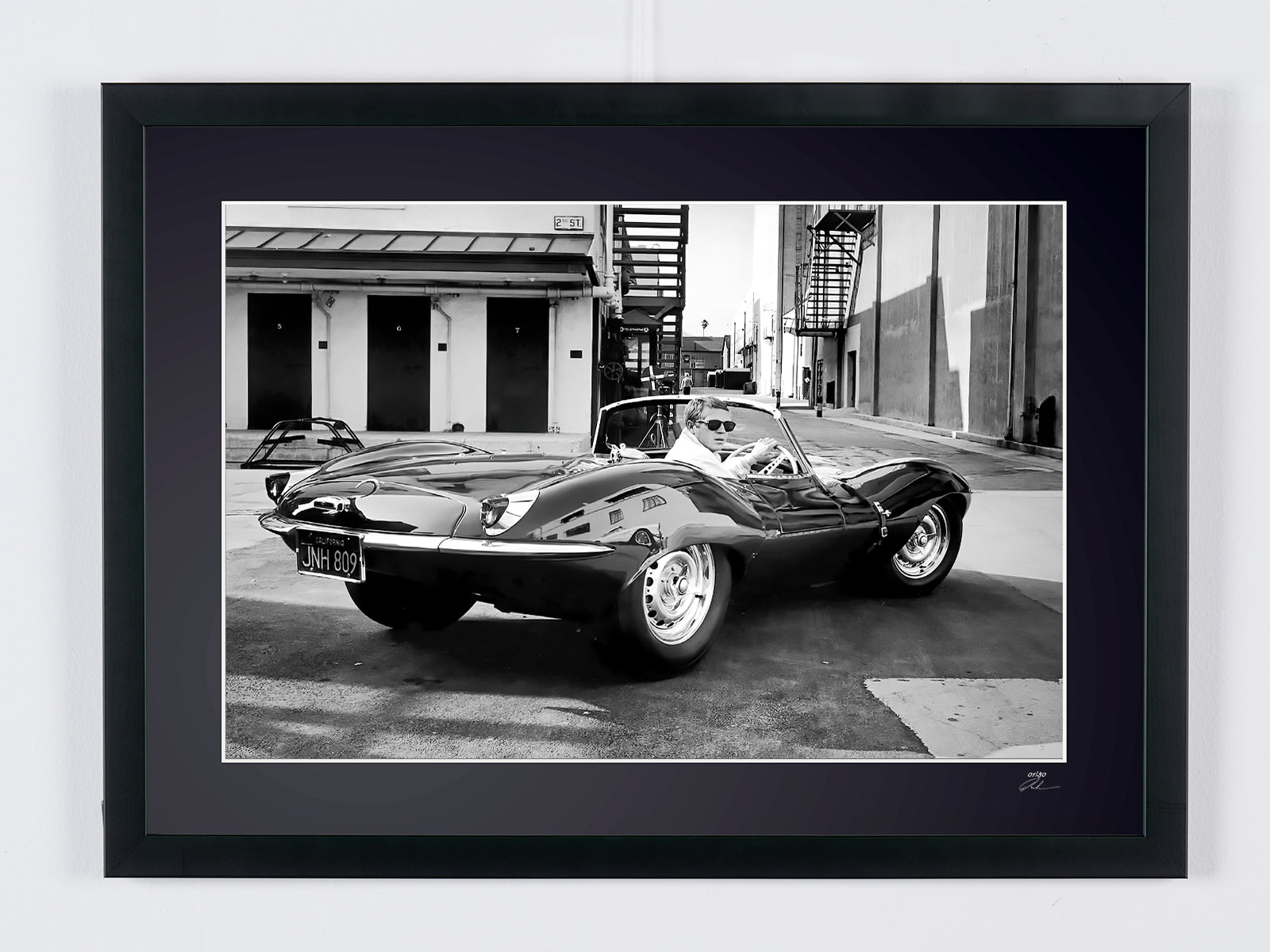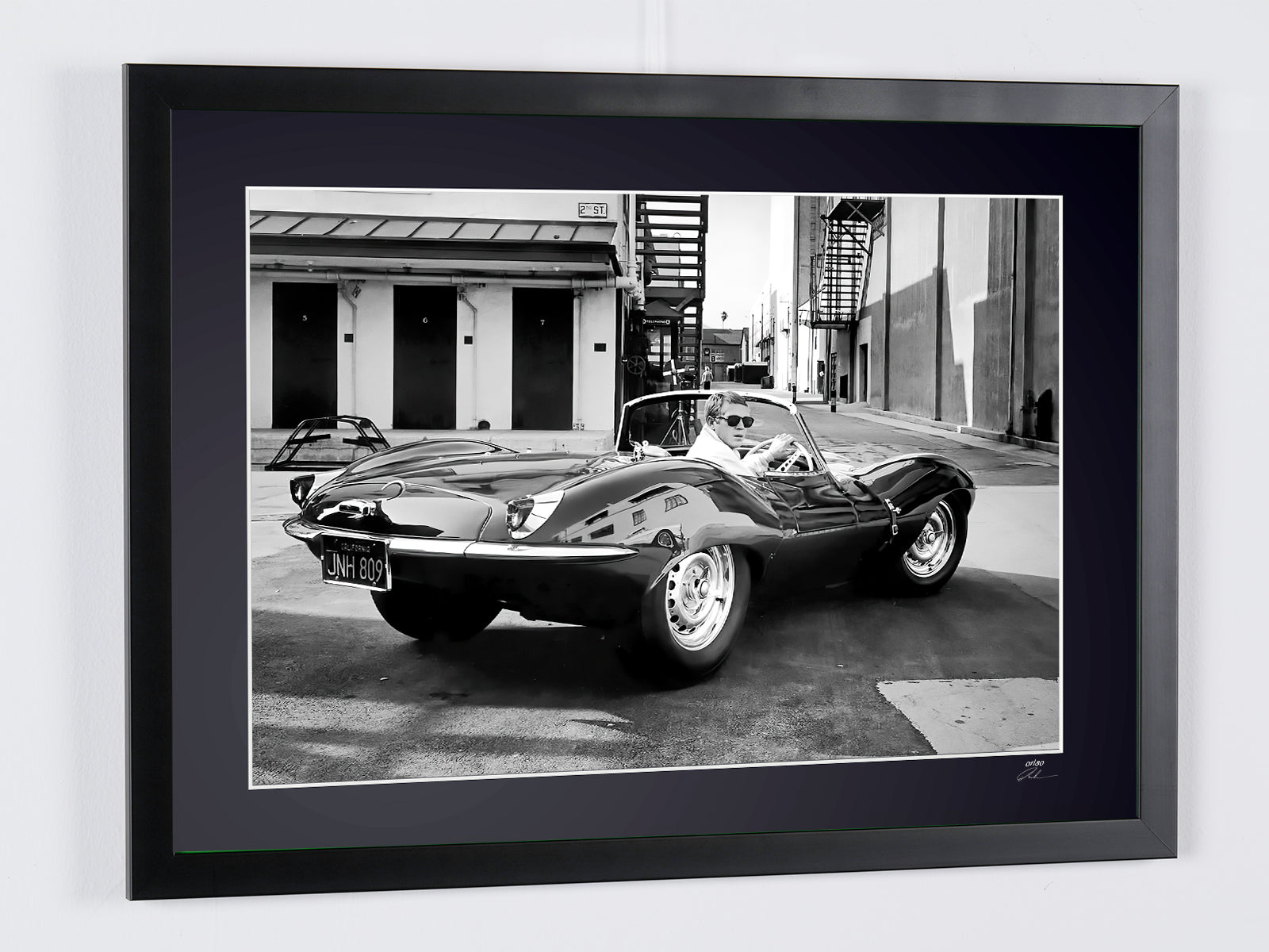 Photo encadrée de "Steve McQueen and 1956 Jaguar Xkss" — Tirage d'art noir et blanc sur papier Fine Art 70x50 cm