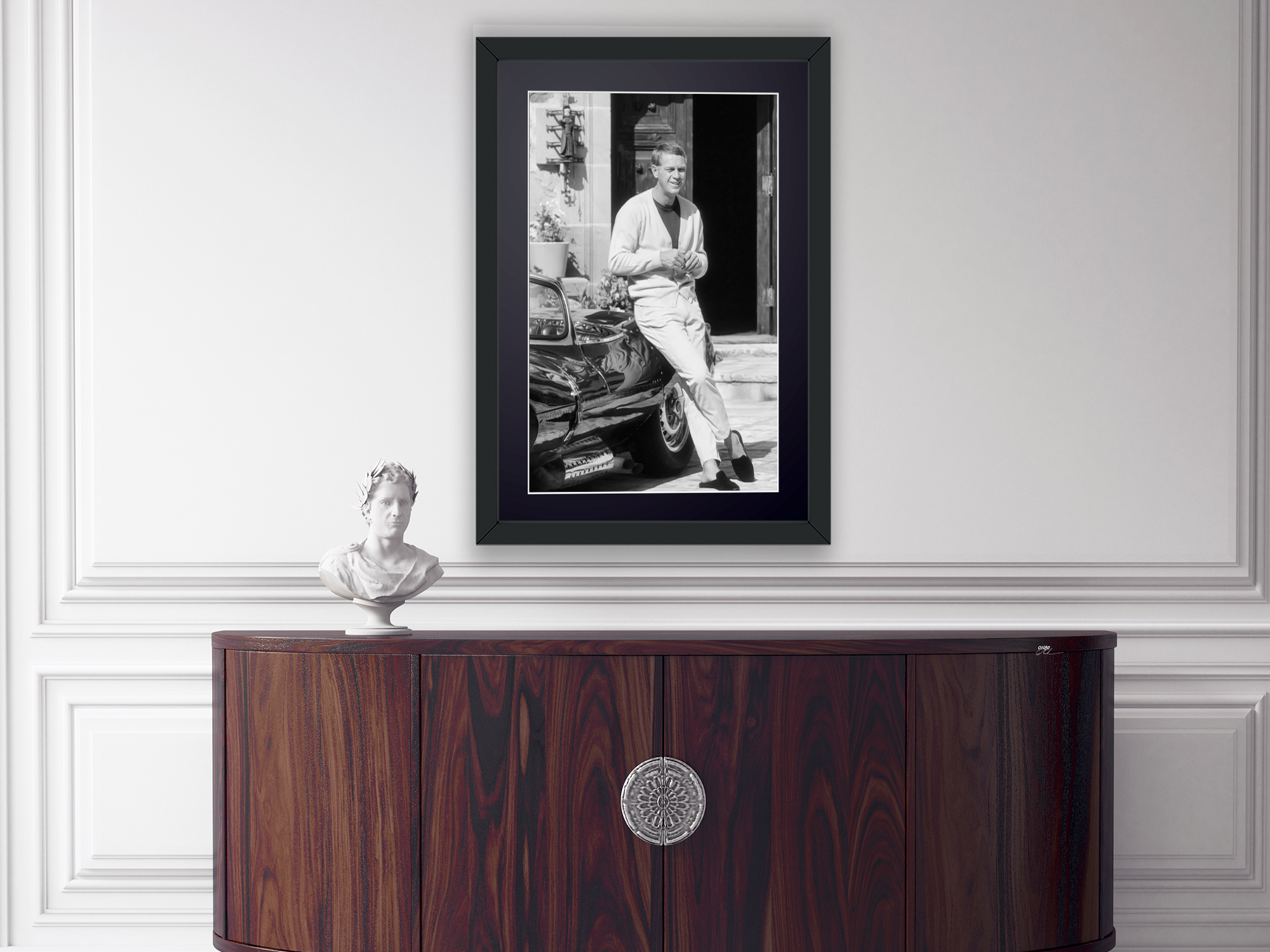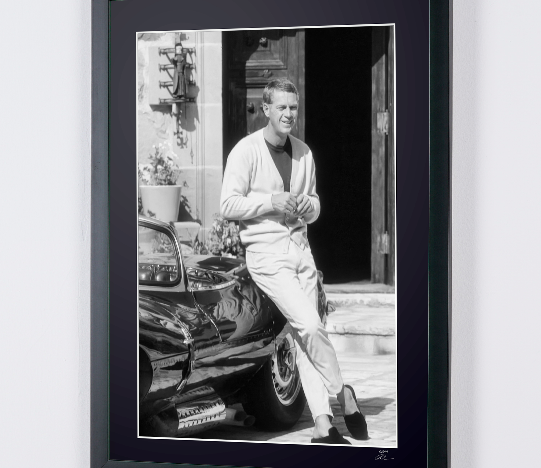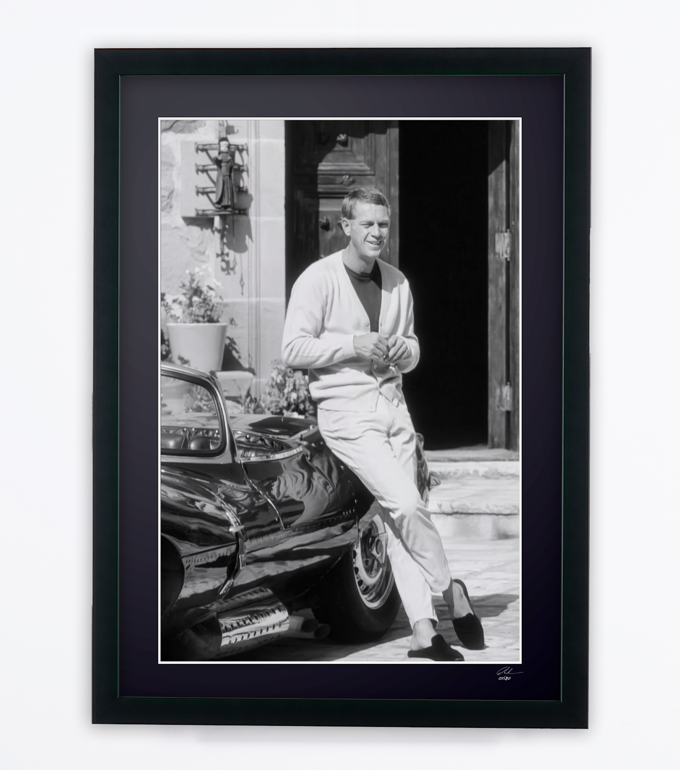 Photo encadrée de "Steve McQueen At home California - Jaguar XK-SS en 1966" — Tirage d'art noir et blanc sur papier Fine Art 70x50 cm