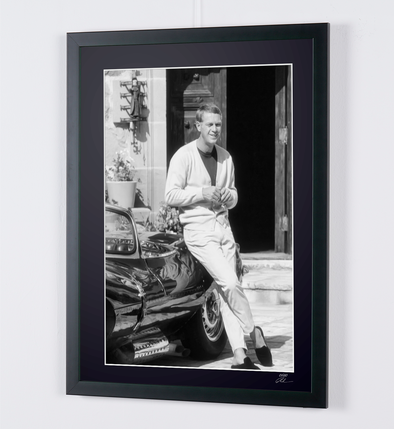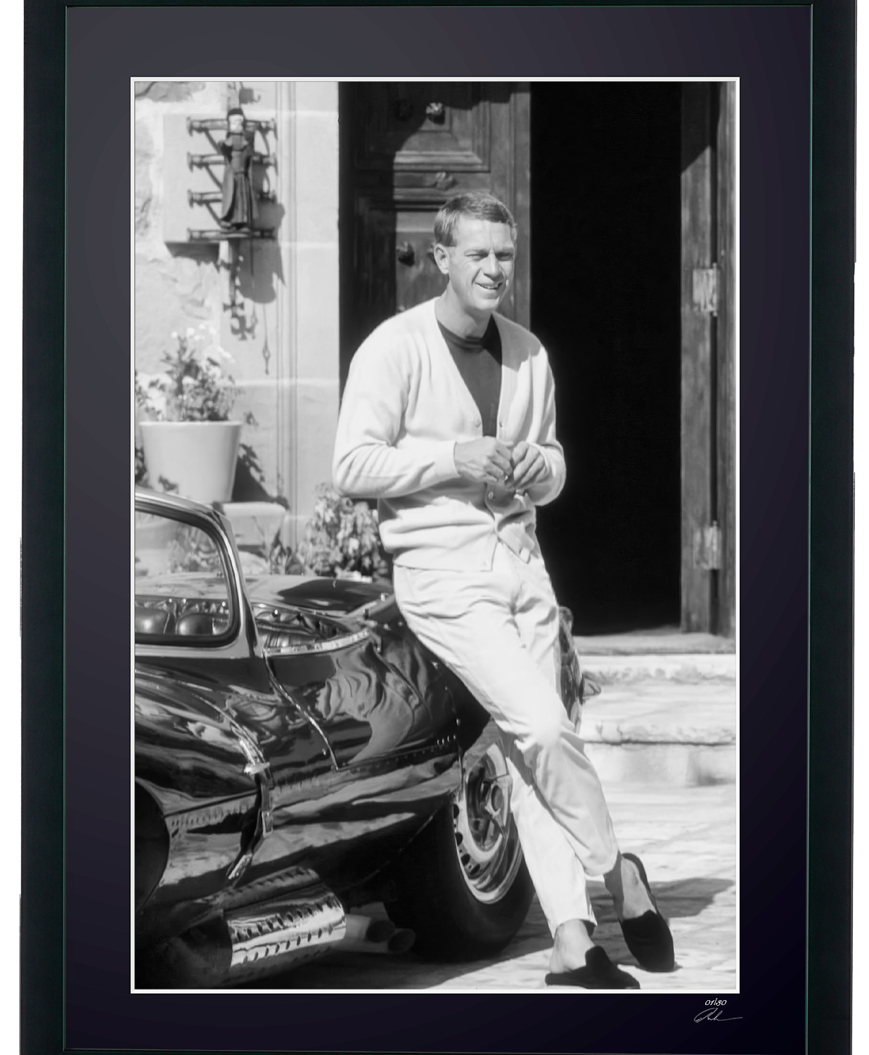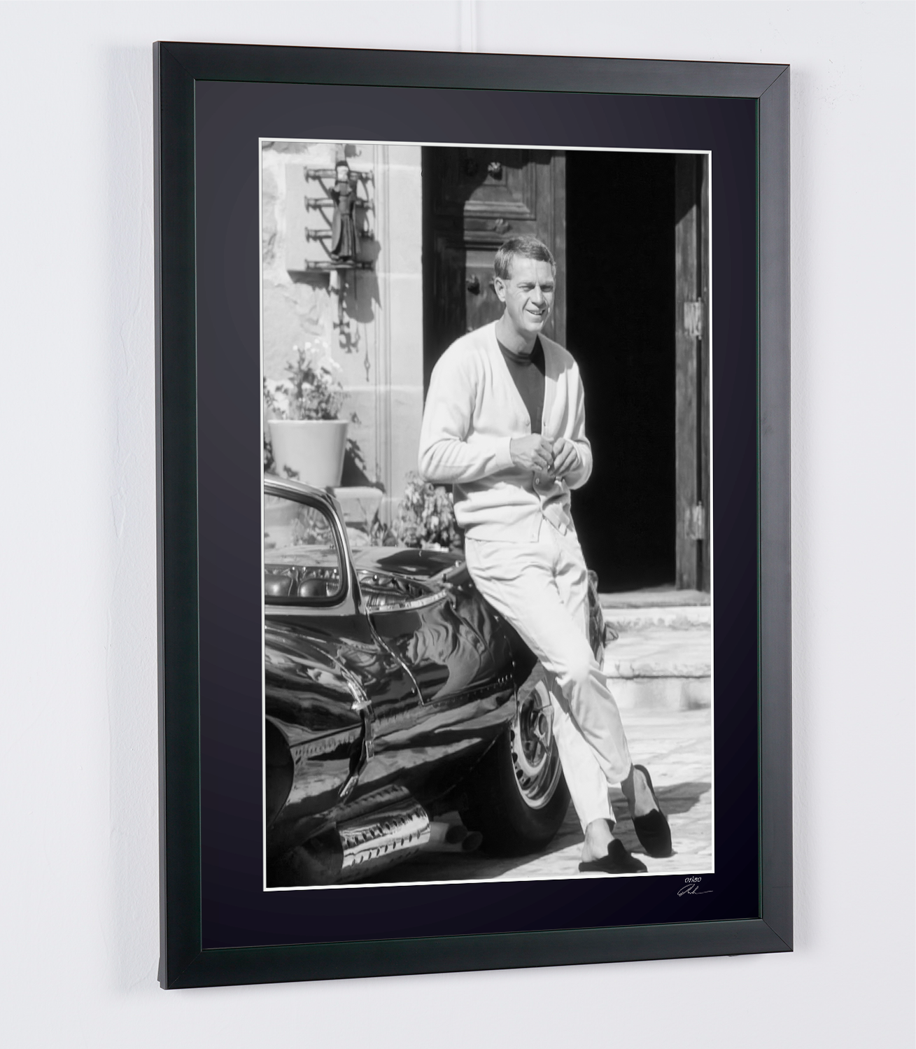 Photo encadrée de "Steve McQueen At home California - Jaguar XK-SS en 1966" — Tirage d'art noir et blanc sur papier Fine Art 70x50 cm