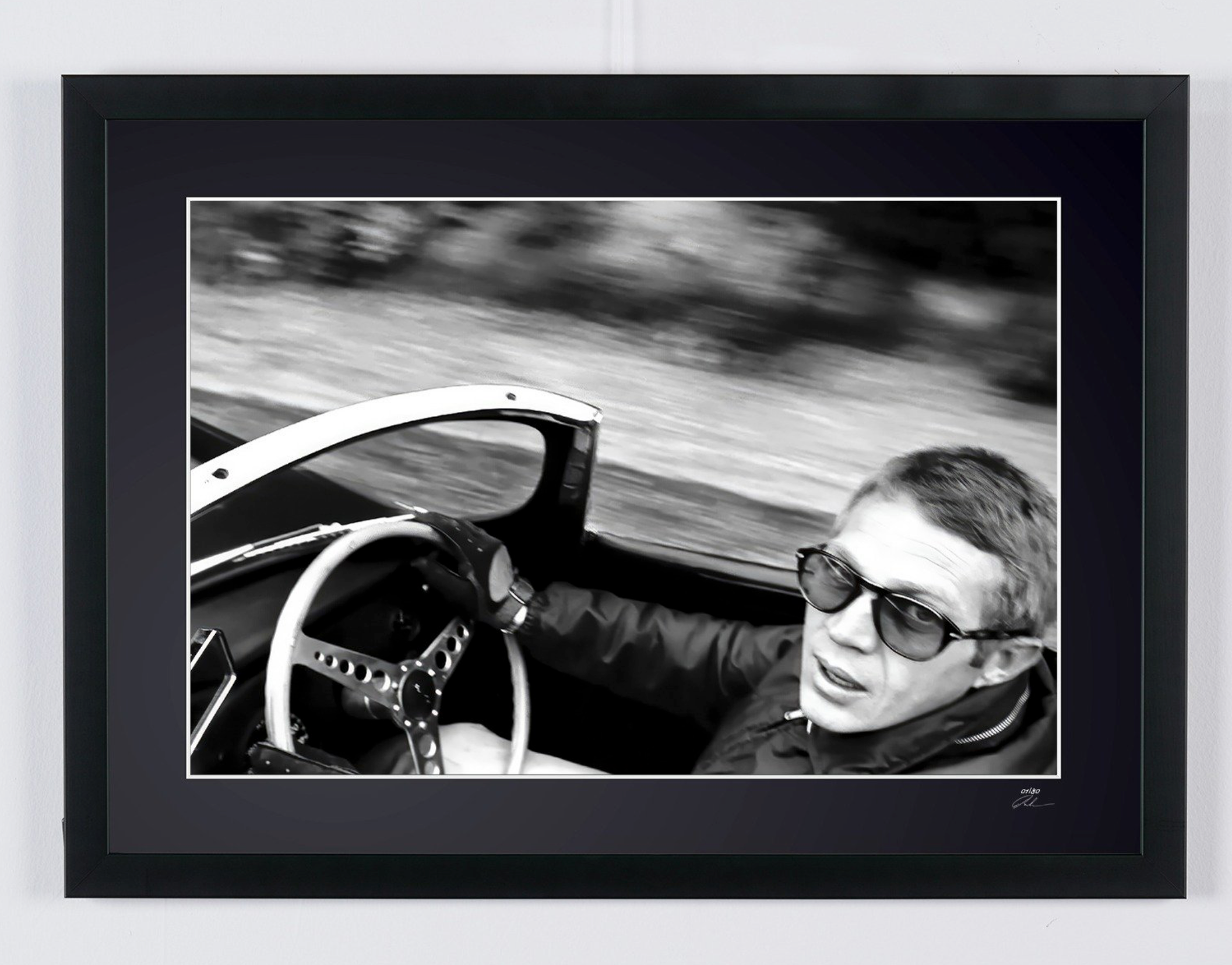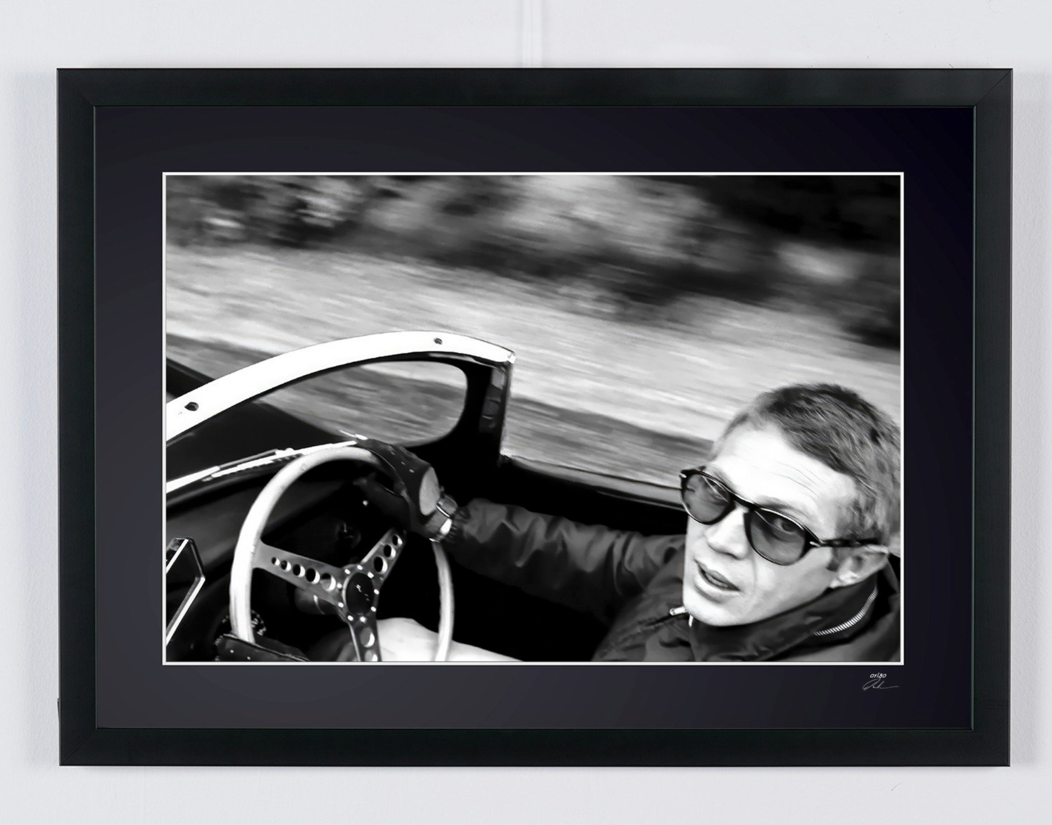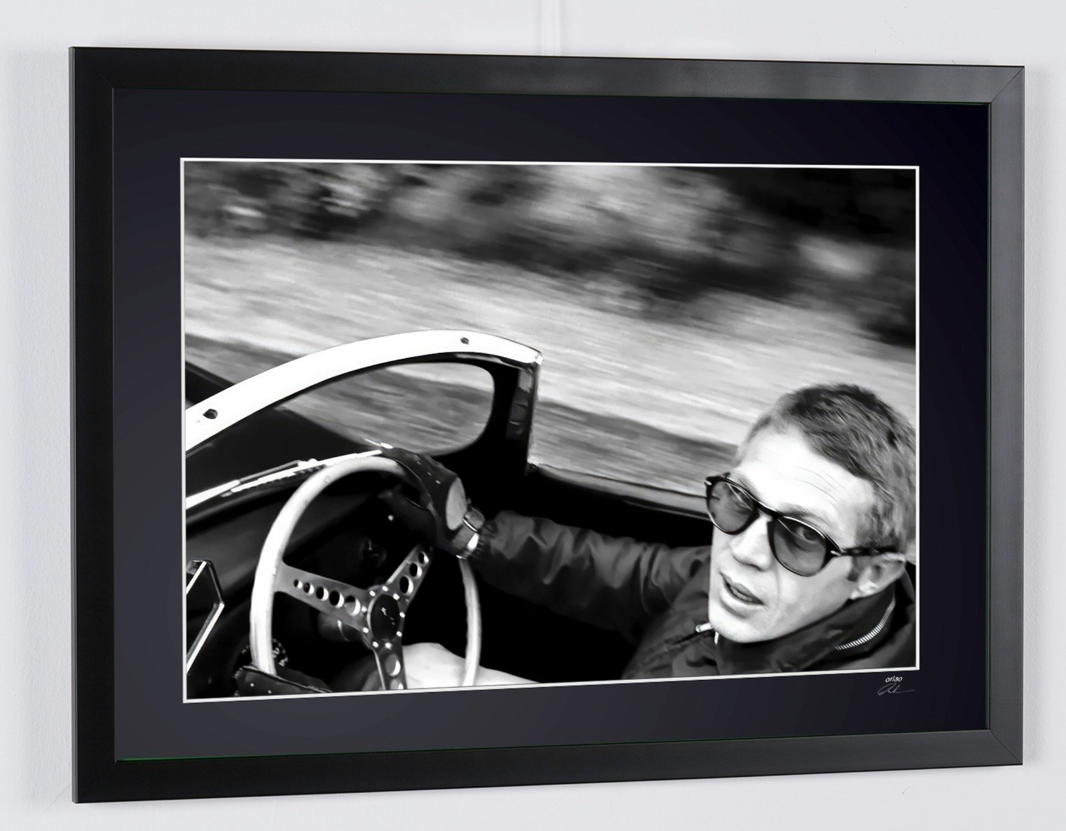 Photo encadrée de "Steve McQueen - Drives Jaguar XK-SS 1962" — Tirage d'art noir et blanc sur papier Fine Art 70x50 cm