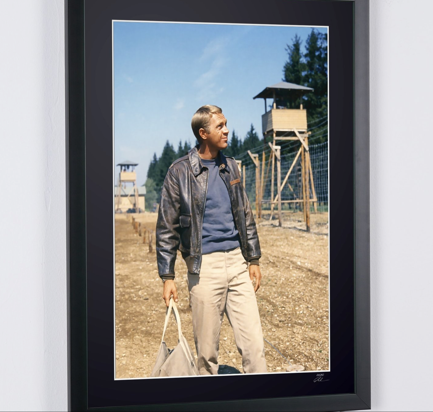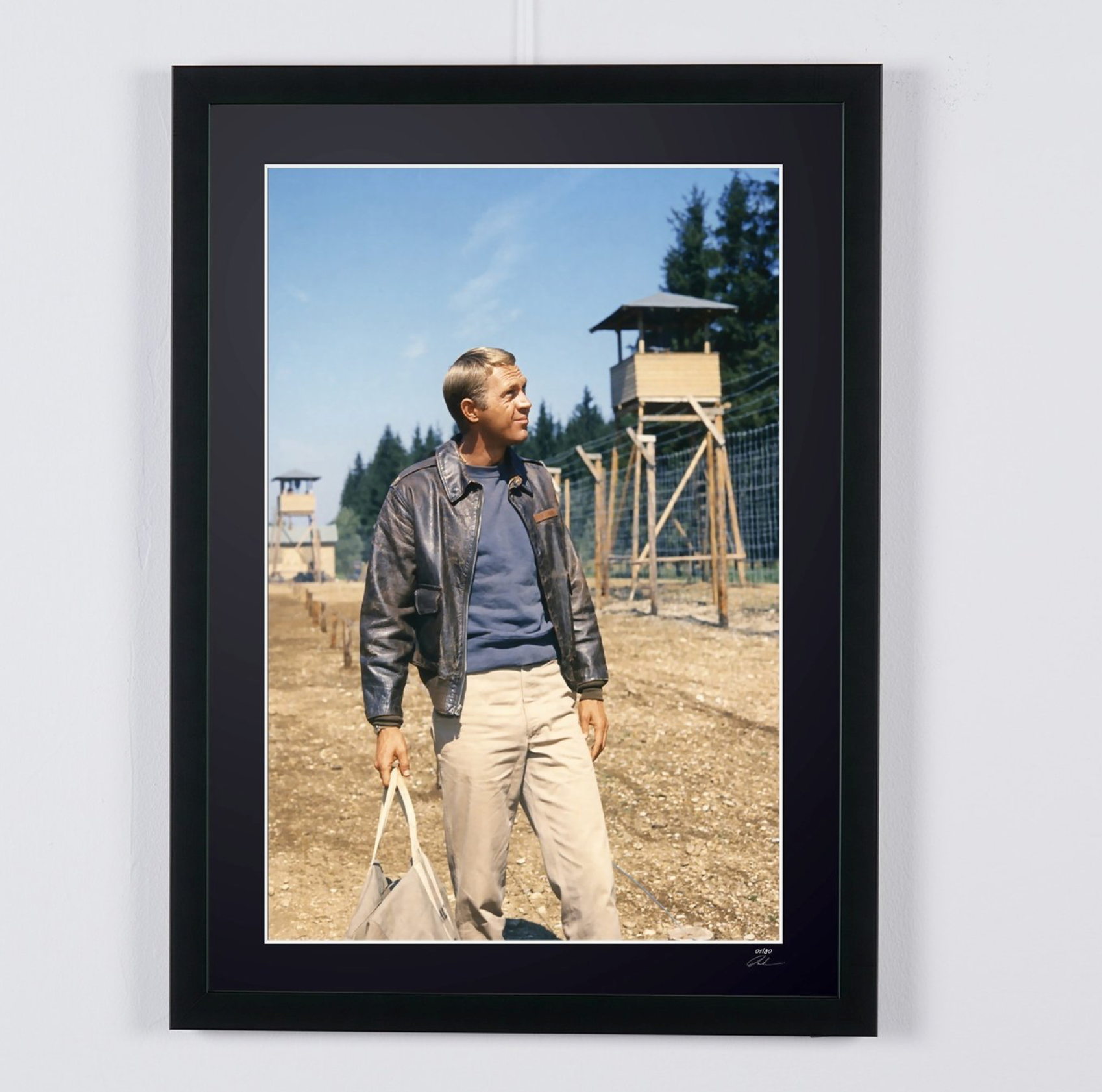 Photo encadrée de "The Great Escape 1963 - Steve McQueen on set of" — Tirage d'art noir et blanc sur papier Fine Art 70x50 cm