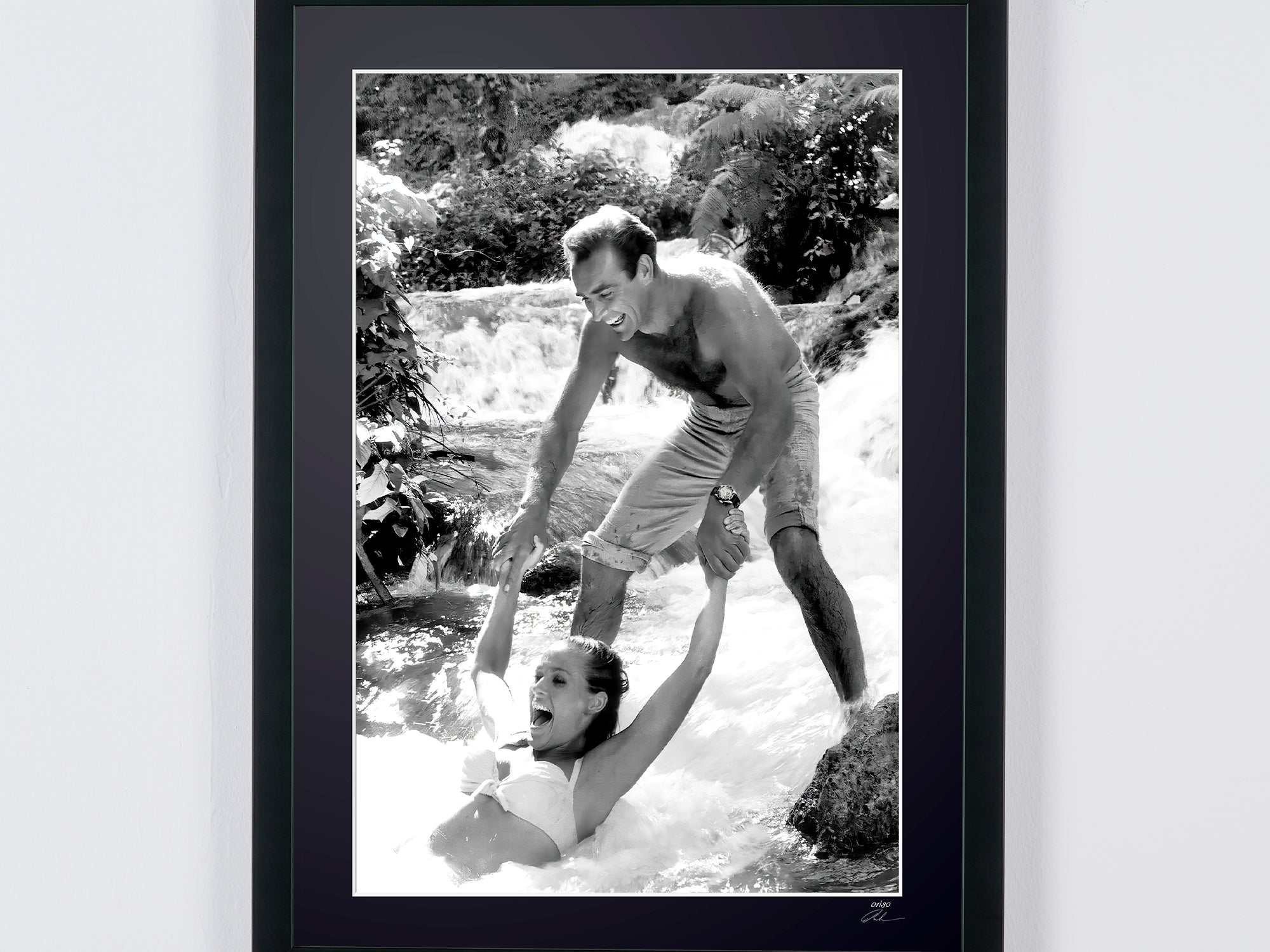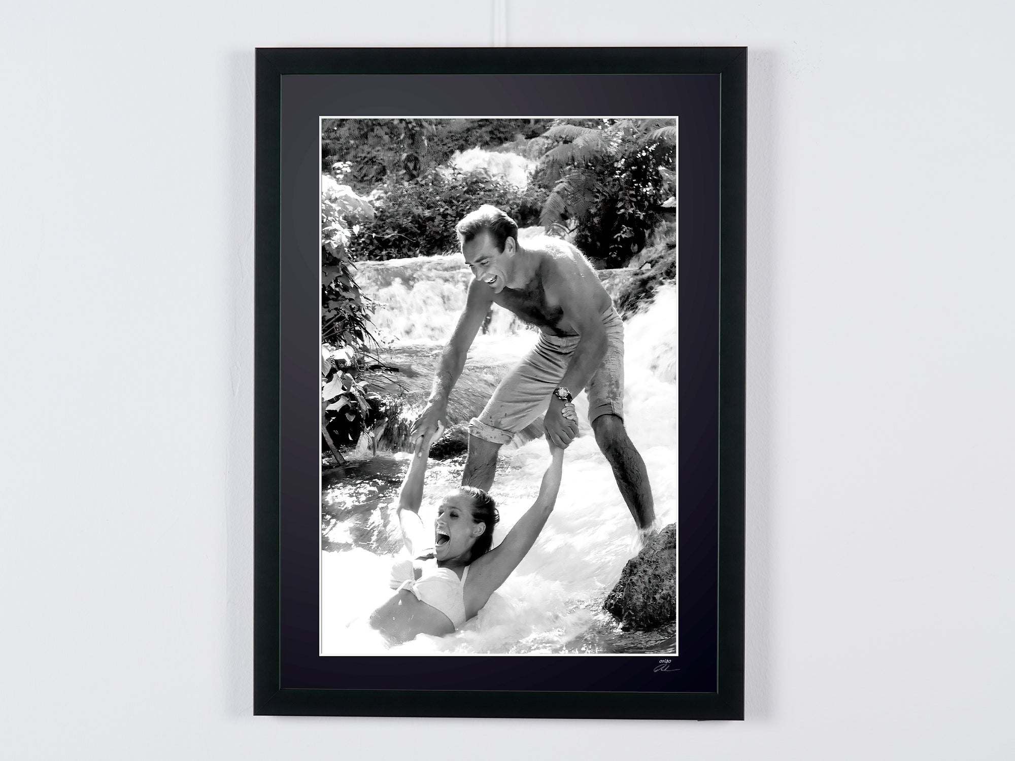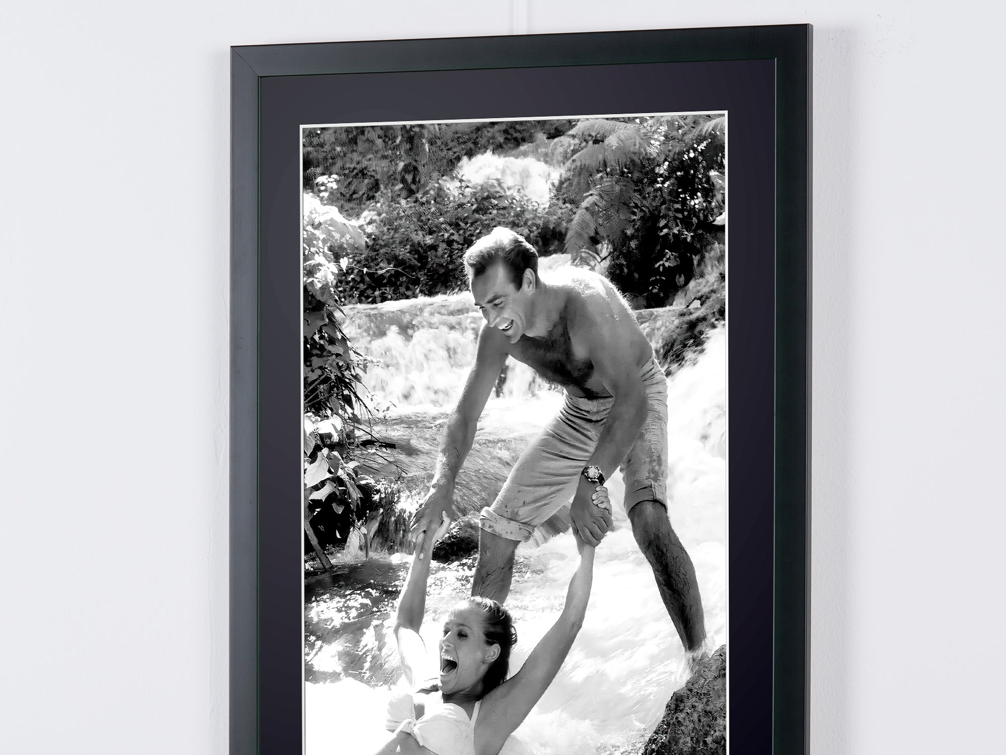 Fotografia emoldurada de «James Bond 007: Dr. No, Connery e Ursula Andress nos bastidores em Dunns River» — Impressão artística a preto e branco em papel Fine Art 70x50 cm
