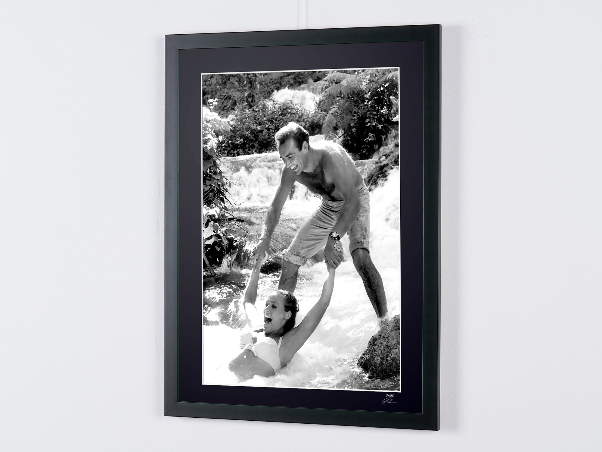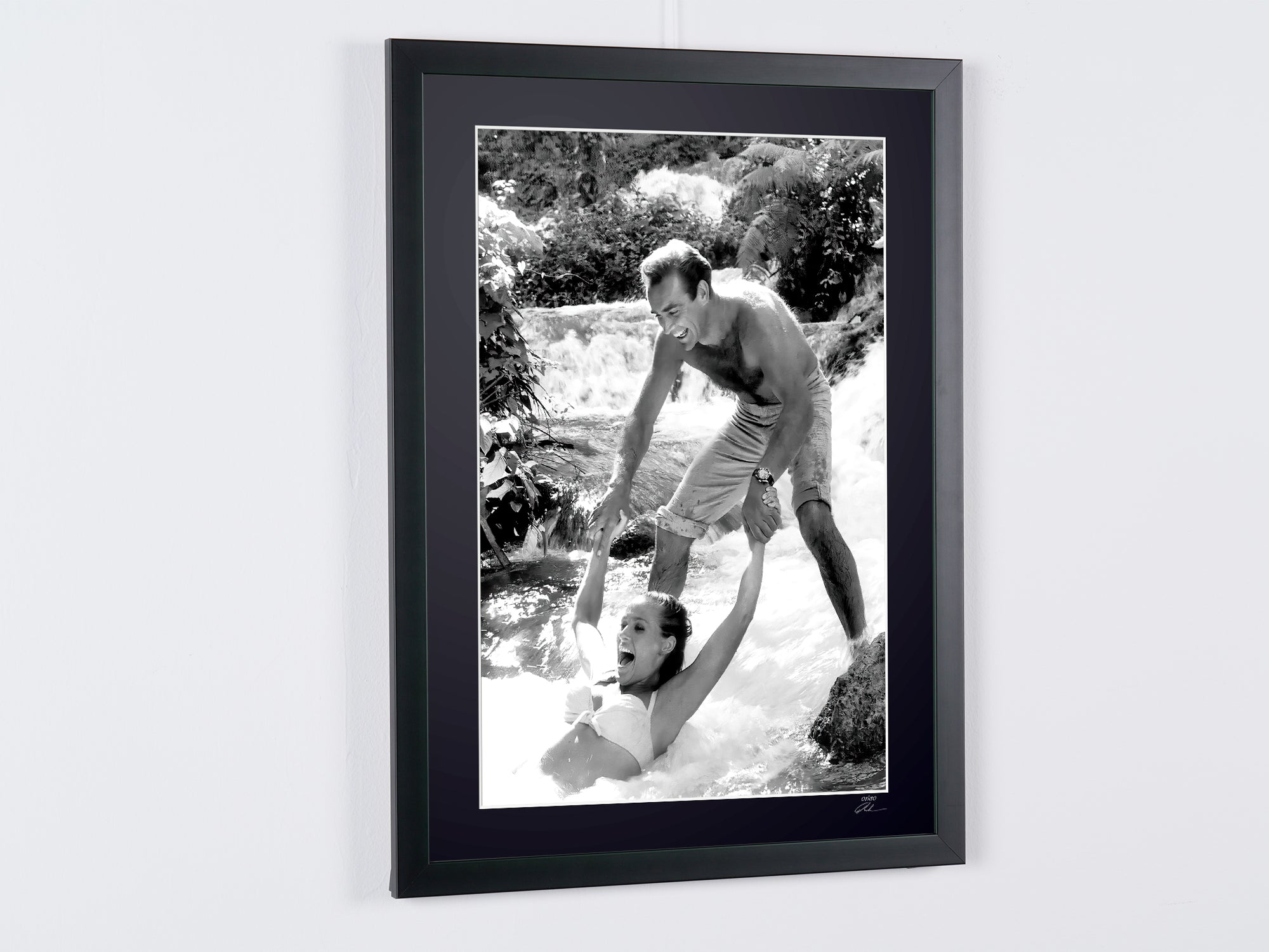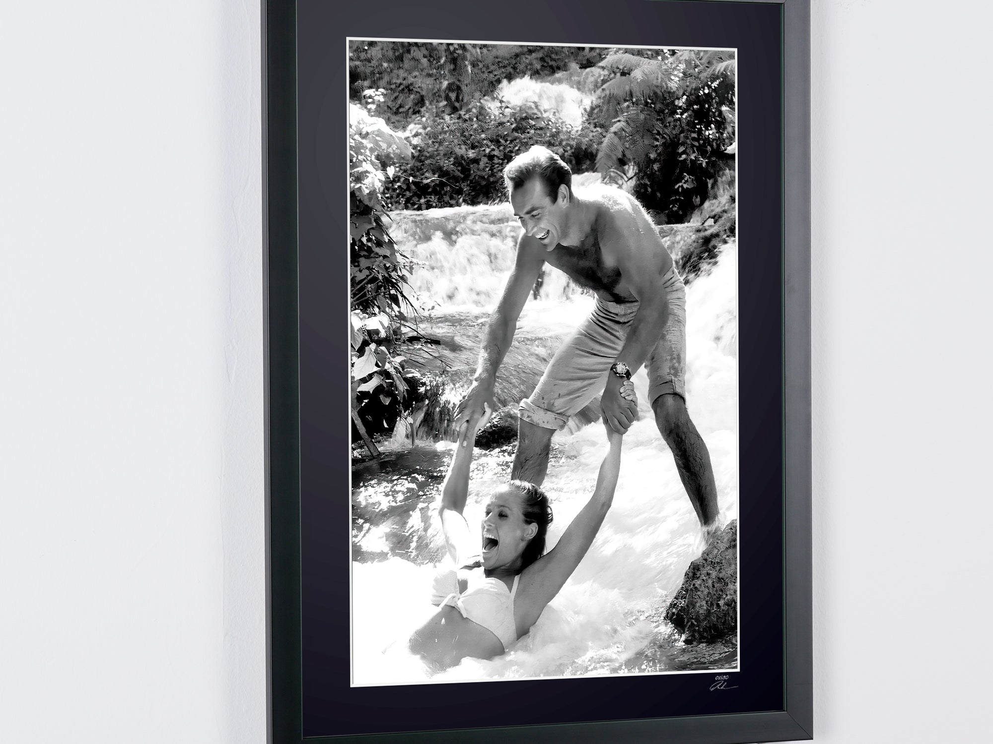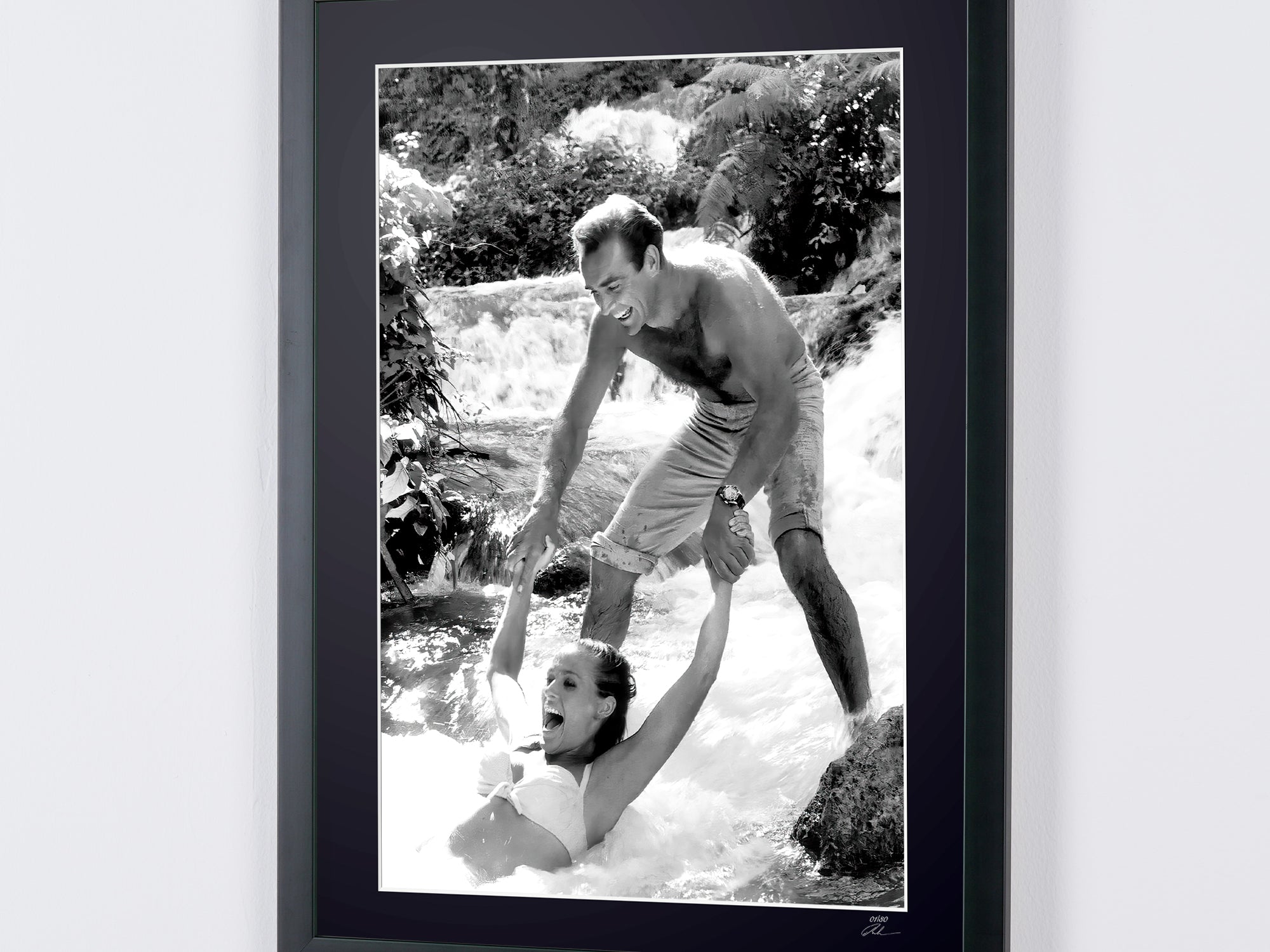 Fotografia emoldurada de «James Bond 007: Dr. No, Connery e Ursula Andress nos bastidores em Dunns River» — Impressão artística a preto e branco em papel Fine Art 70x50 cm